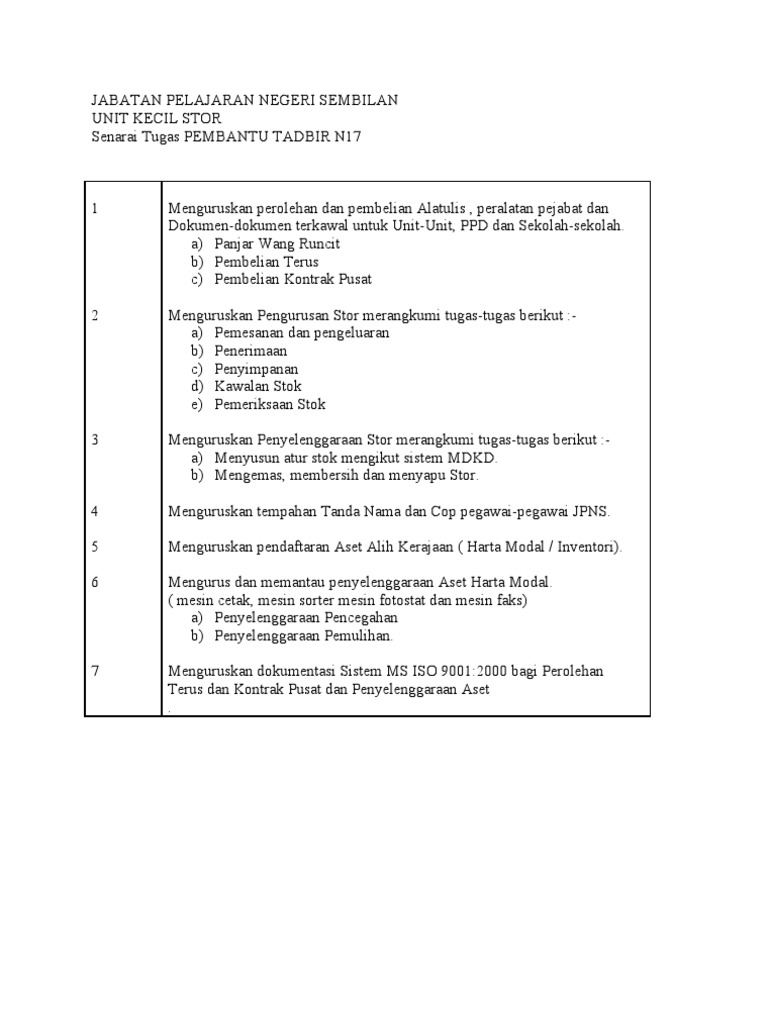 Senarai Tugas Pembantu Tadbir N17 Sekolah Senarai Tugas Pembantu Am Pejabat Deskripsi Tugas Pembantu Tadbir Perkeranian Operasi Gred N19 Shatara Satryo